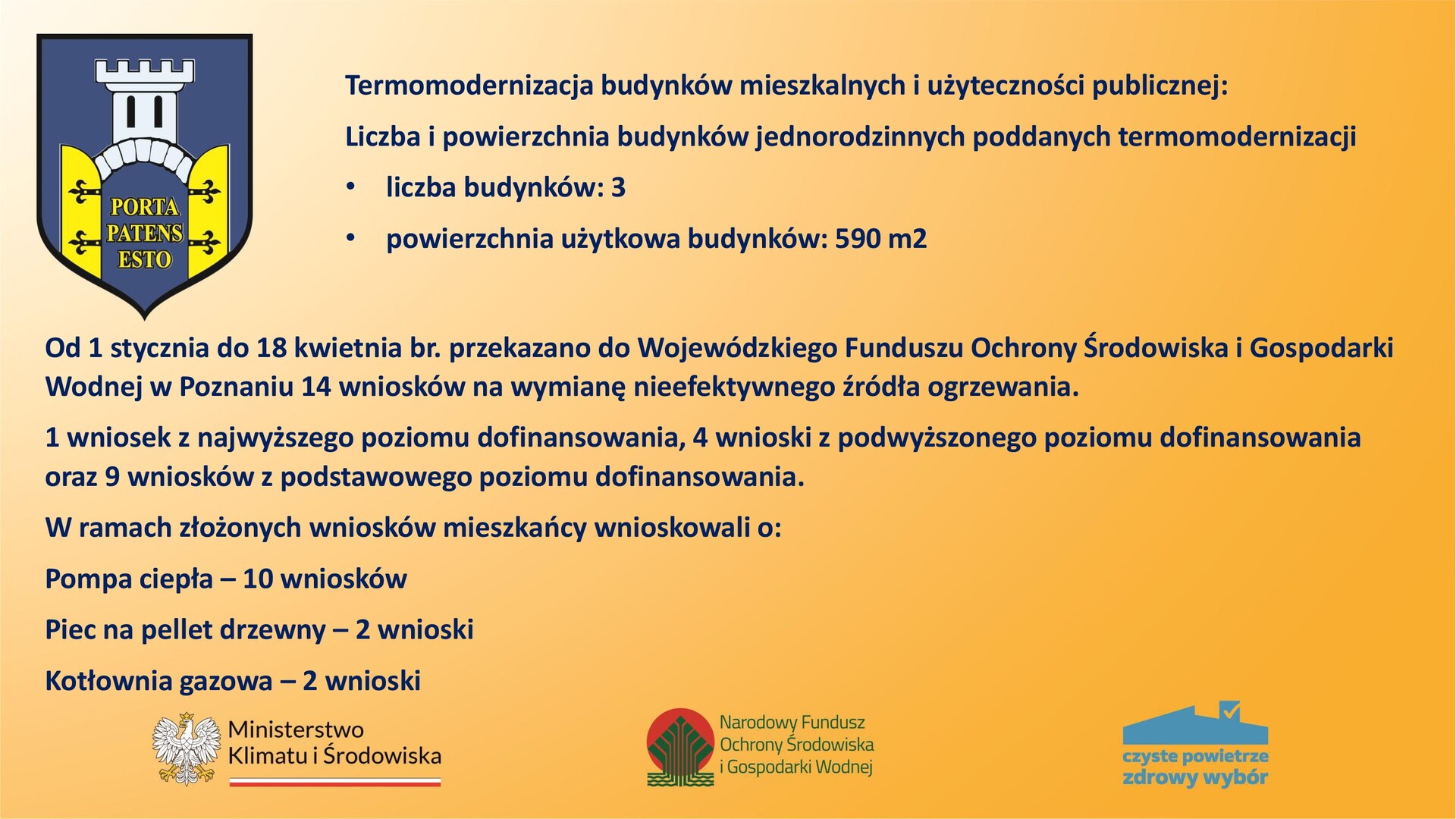 Od 1 stycznia 2023 do 18 kwietnia br. przekazano do Wojewódzkiego Funduszu Ochrony Środowiska i Gospodarki Wodnej w Poznaniu 14 wniosków na wymianę nieefektywnego źródła ogrzewania.