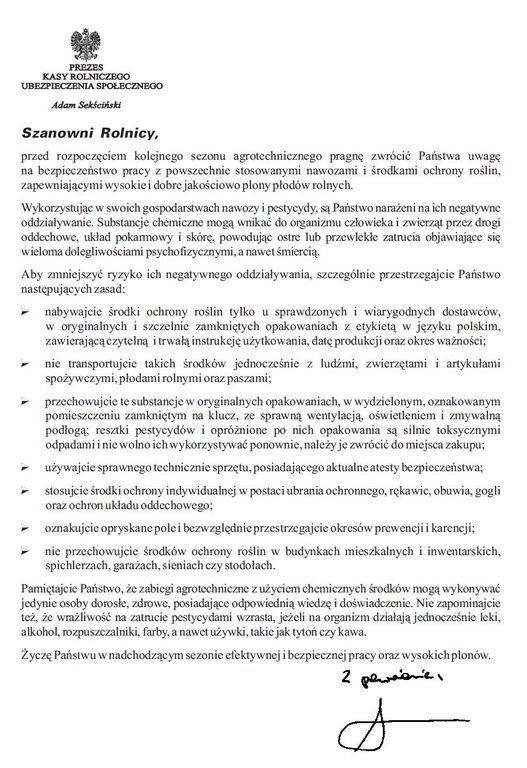 Prezes Kasy Rolniczego Ubezpieczenia Społecznego Pan Adam Sekściński przed rozpoczęciem kolejnego sezonu agrotechnicznego zwraca uwagę rolników na bezpieczeństwo pracy z stosowanymi nawozami i środkami ochrony roślin.