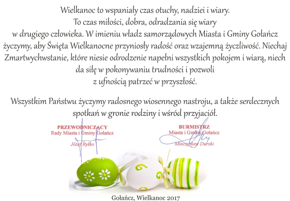 To czas miłości, dobra, odradzania się wiary w drugiego człowieka. W imieniu władz samorządowych Miasta i Gminy Gołańcz życzymy, aby Święta Wielkanocne przyniosły radość oraz wzajemną życzliwość. Niechaj Zmartwychwstanie, które niesie odrodzenie napełni wszystkich pokojem i wiarą, niech da siłę w pokonywaniu trudności i pozwoli z ufnością patrzeć w przyszłość.
