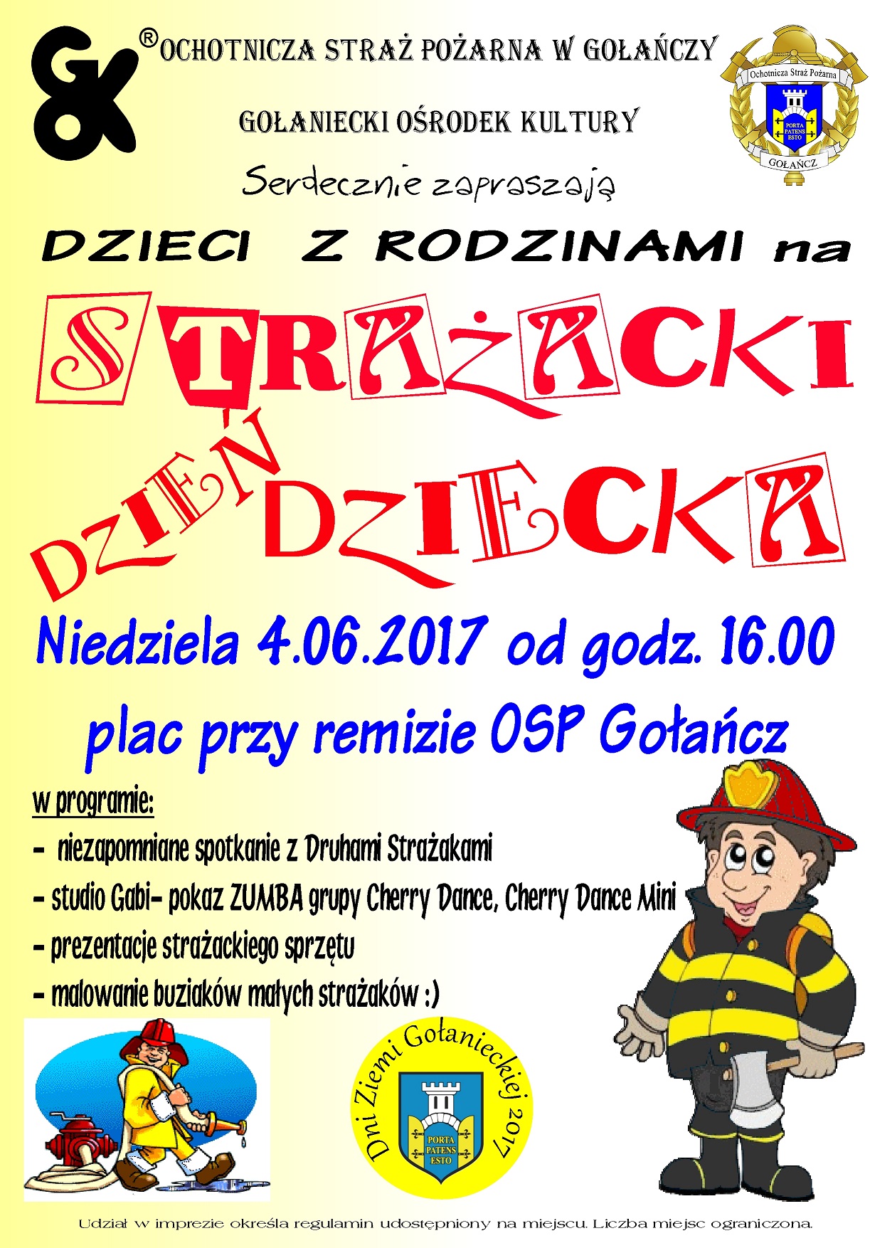 Ochotnicza Straż Pożarna wraz z Gołanieckim Ośrodkiem Kultury zapraszają dzieci wraz z rodzinami na strażacki Dzień Dziecka. Szczegóły na plakacie.