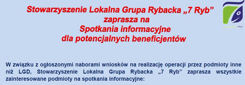 Stowarzyszenie Lokalna Grupa Rybacka "7-Ryb" zaprasza na spotkania informacyjne z potencjalnymi beneficjentami. Szczegóły na plakacie.