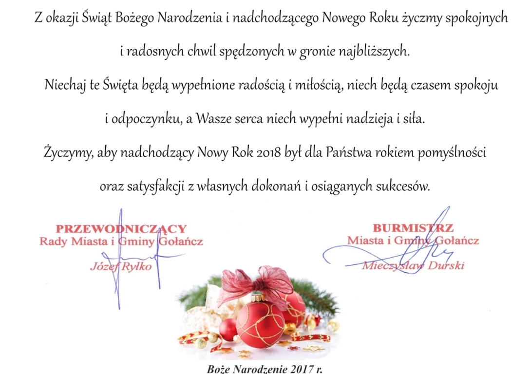 Z okazji Świąt Bożego Narodzenia i nadchodzącego Nowego Roku życzmy spokojnych