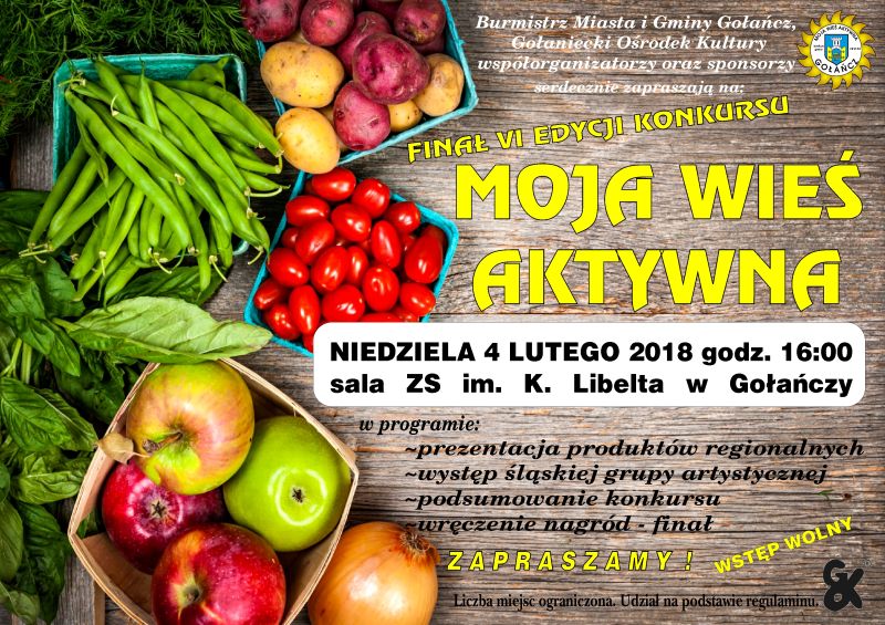 W niedzielę 4 lutego o godz. 16.00 w w hali sportowej Zespołu Szkół przy ulicy Walki Młodych w Gołańczy rozpocznie się VI finał konkursu "Moja Wieś Aktywna". Szczegóły na załączonym plakacie.