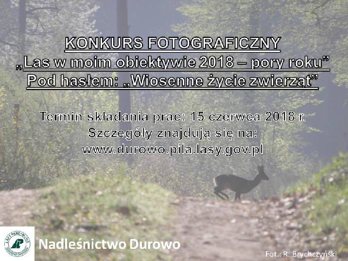 Nadleśnictwo Durowo ogłasza wiosenną edycję konkursu fotograficznego "Las w moim obiektywie 2018 - pory roku". Tym razem tematem przewodnim jest "Wiosenne życie zwierząt". Konkurs skierowany jest do fotografów amatorów realizujacych swoją pasję na terenie nadleśnictwa. W załącznikach znajdują się regulamin konkursu oraz niezbędne "Oświadczenie o ochronie danych osobowych".