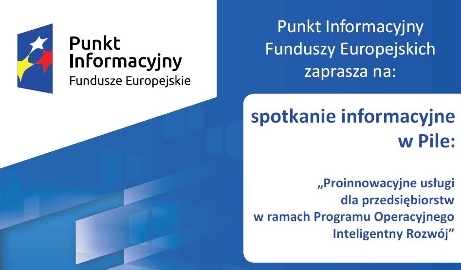 Punkt Informacyjny Funduszy Europejskich zaprasza na spotkanie informacyjne: „Proinnowacyjne usługi dla przedsiębiorstw w ramach Programu Operacyjnego Inteligentny Rozwój”. Spotkanie odbędzie się w dniu 18 kwietnia 2018 r. w godz: 9.00-11.00 w Punkcie Informacyjnym Funduszy Europejskich w Pile przy WARP Sp. z o.o. ul. Grunwaldzka 2, 64-920 Piła w sali szkoleniowej.