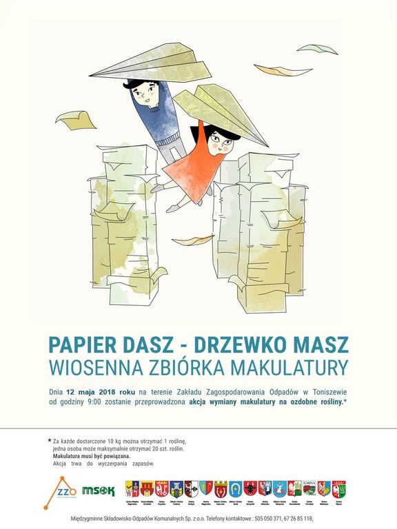 12 maja 2018r. na terenie Zakładu Zagospodarowania Odpadów w Toniszewie odbędzie się wiosenna zbiórka makulatury.