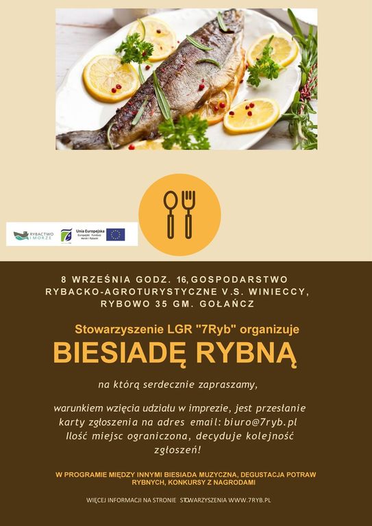 Stowarzyszenie LGR "7 Ryb" zaprasza do wzięcia udziału w Biesiadzie Rybnej, która odbędzie się 8 września br. w Rybowie (gmina Gołańcz). Osoby chętne prosimy o wypełnienie karty zgłoszenia wraz z oświadczeniem o wyrażeniu zgody na przetwarzanie danych osobowych (zał. nr 1) i przesłanie na adres stowarzyszenie7ryb@wp.pl lub biuro@7ryb.pl Więcej informacji na plakacie.