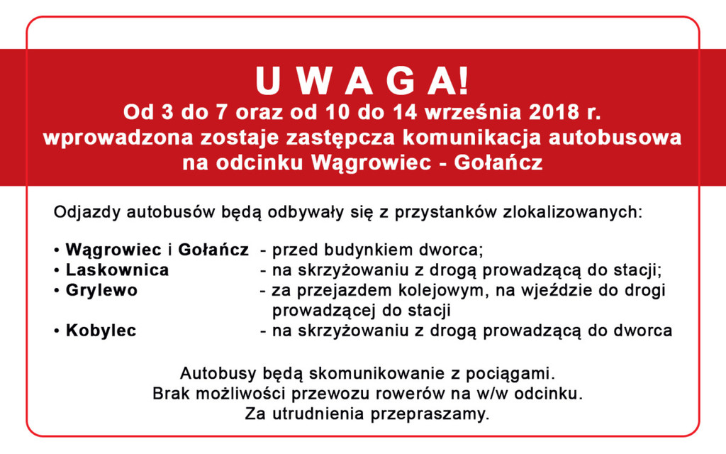 Koleje Wielkopolskie wprowadzają autobusową komunikację zastępczą na odcinku z Gołańczy do Wągrowca.