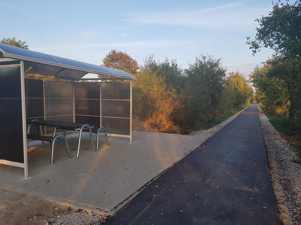 W ramach zadania wykonano nawierzchnię z betonu asfaltowego, miejsca postoju, czyli wiaty wraz z ławkami i stolikami, przy ścieżce usytuowane są lamy z oprawą LED z modułem fotowoltaicznym oraz barierki ochronne biało – czerwone.
