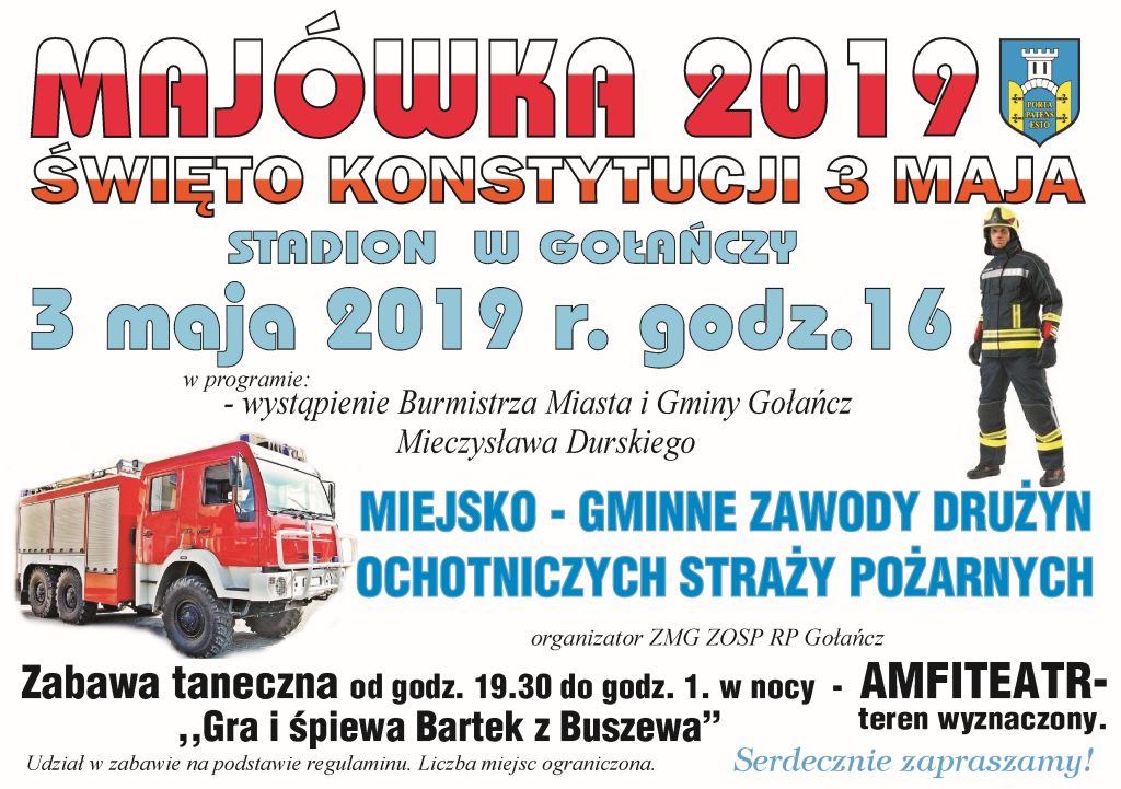 3 maja na stadionie miejskim w Gołańczy o godzinie 16.00 rozpoczną się Miejsko - Gminne Zawody Sportowo - Pożarnicze OSP. O godz. 19.30 w amfiteatrze rozpocznie się zabawa taneczna. Szczegóły na plakacie.