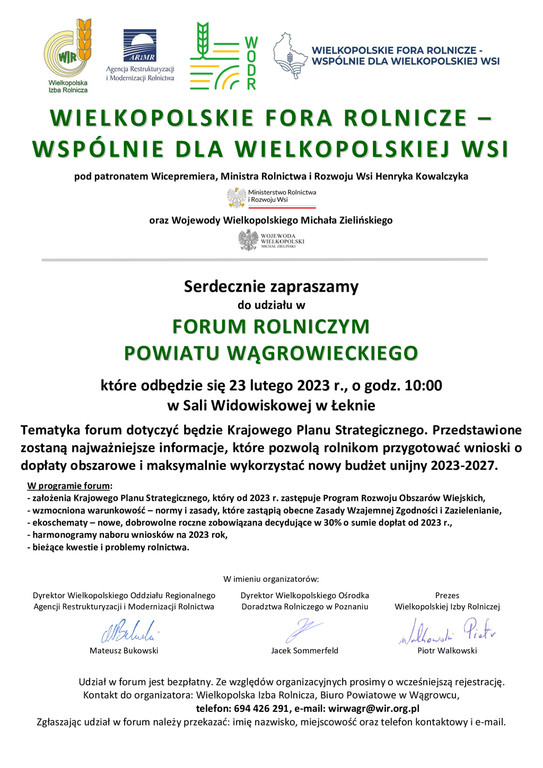 Dnia 23 lutego 2023 r. o godz. 10:00 w Sali Widowiskowej w Łeknie odbędzie się forum rolnicze powiatu wągrowieckiego.