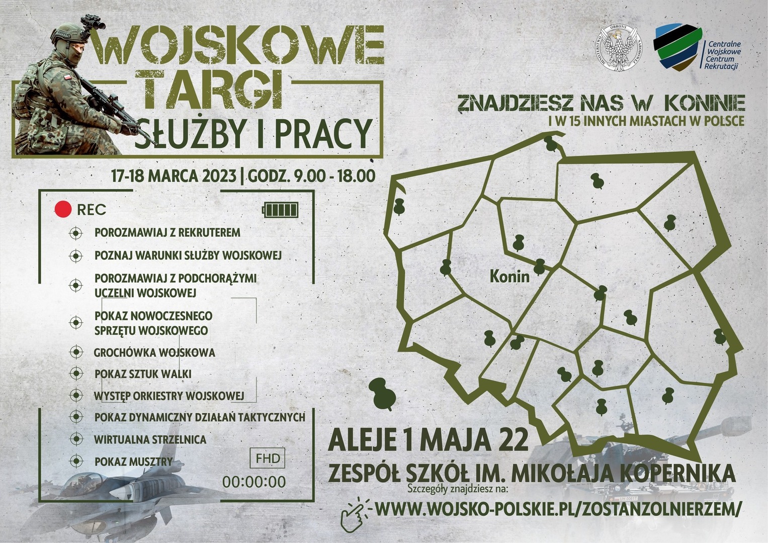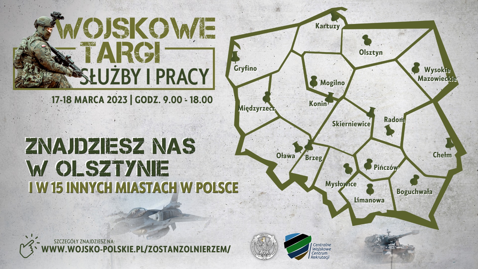 Po raz pierwszy Ministerstwo Obrony Narodowej oraz Centralne Wojskowe Centrum Rekrutacji organizują WOJSKOWE TARGI SŁUŻBY I PRACY. To jedyne w Polsce wydarzenie w całości poświęcone promocji nowych form służby wojskowej wprowadzonych ustawą o obronie Ojczyzny. Targi odbędą się w Olsztynie oraz w 15 miastach w Polsce, 17-18 marca 2023 r. (piątek – sobota) w godz. 9.00-18.00. Zainteresują wszystkich tych, którzy szukają ciekawej pracy, chcą podjąć nowe wyzwania w swoim życiu i zobaczyć na żywo profesjonalizm żołnierzy Wojska Polskiego.