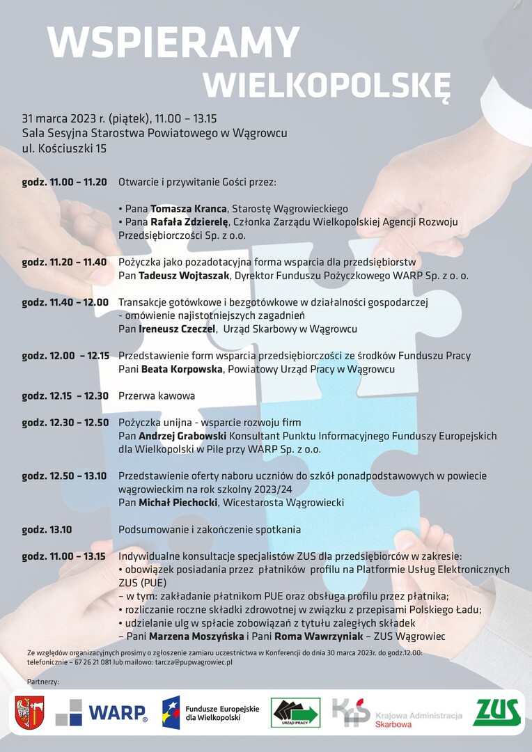 Starostwo Powiatowe w Wągrowcu oraz Wielkopolska Agencja Rozwoju Przedsiębiorczości Sp. z o.o. serdecznie zapraszają na konferencję pn. „Wspieramy Wielkopolskę”.