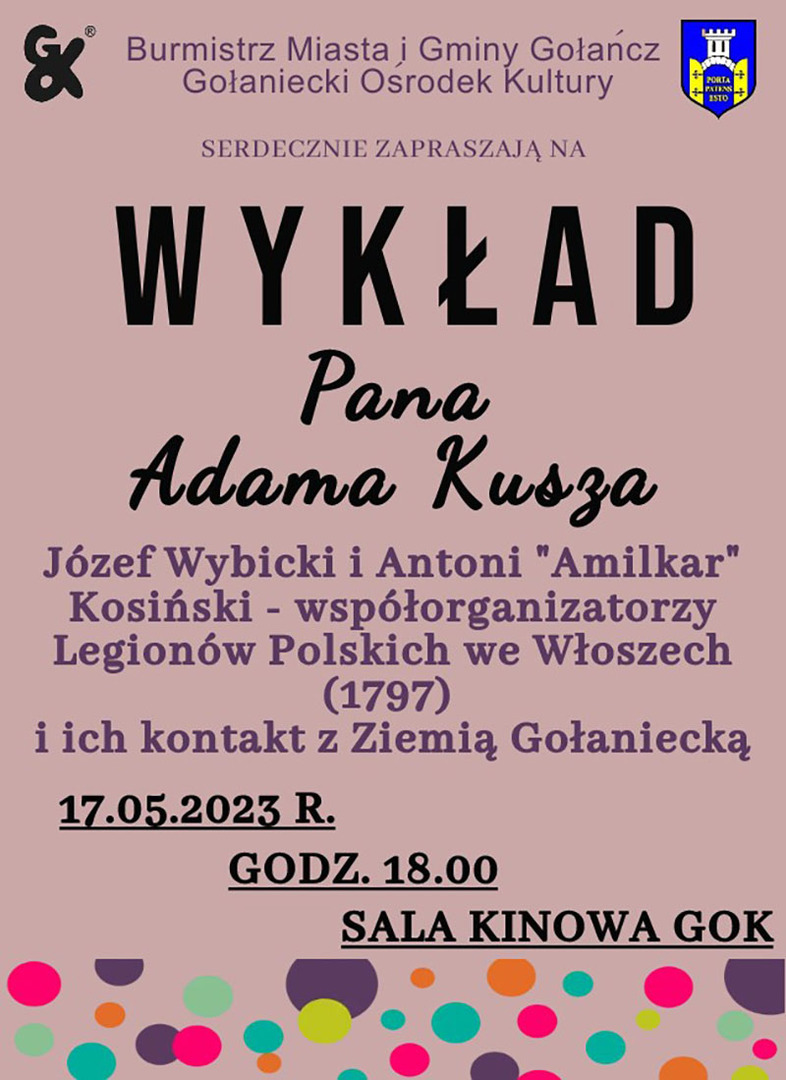 Wykład zatytułowany: Józef Wybicki i Antoni "Amilkar" Kosiński - współorganizatorzy Legionów Polskich we Włoszech (1797) i ich kontakt z ziemią gołaniecką poprowadzi Adam Kusz, honorowy Prezes Stowarzyszenia Towarzystwa Miłośników Ziemi Gołanieckiej.