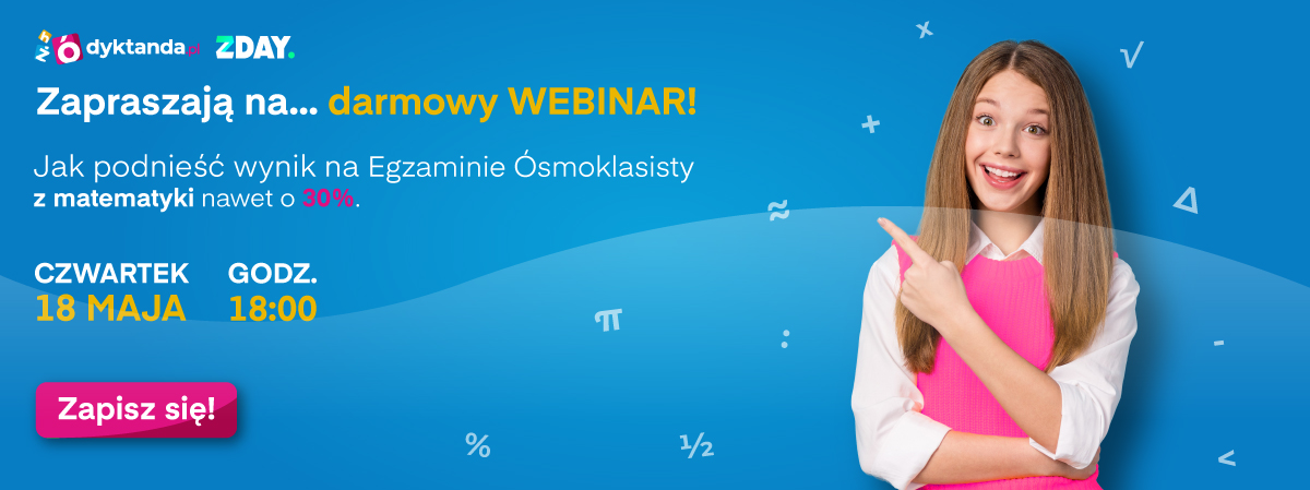 W imieniu portali edukacyjnych Dyktanda.pl i Zday.pl, mamy przyjemność zaprosić uczniów ósmej klasy na darmowy webinar z matematyki przygotowujący do egzaminu ósmoklasisty.