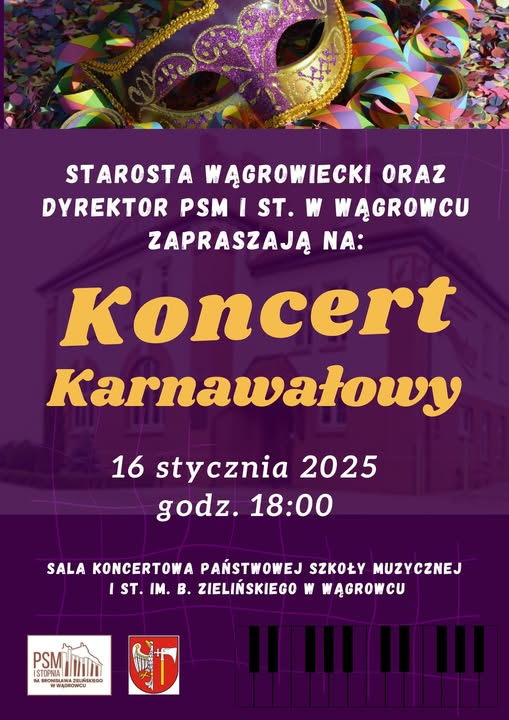 Starosta Wągrowiecki Tomasz Kranc oraz Dyrektor Państwowej Szkoły Muzycznej I st. im. Bronisława Zielińskiego w Wągrowcu zapraszają na Koncert Karnawałowy, który odbędzie się w czwartek 16 stycznia br. w sali koncertowej PSM.