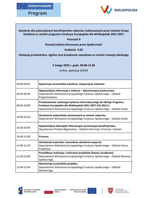 Urząd Marszałkowski Województwa Wielkopolskiego w Poznaniu i Lokalna Grupa Działania - Stowarzyszenie 'Dolina Wełny' serdecznie zapraszają do udziału w szkoleniu on-line potencjalnych beneficjentów programu Fundusze Europejskie dla Wielkopolski 2021-2027 w ramach działania 9.2 Edukacja przedszkolna, ogólna oraz kształcenie zawodowe w ramach rozwoju lokalnego