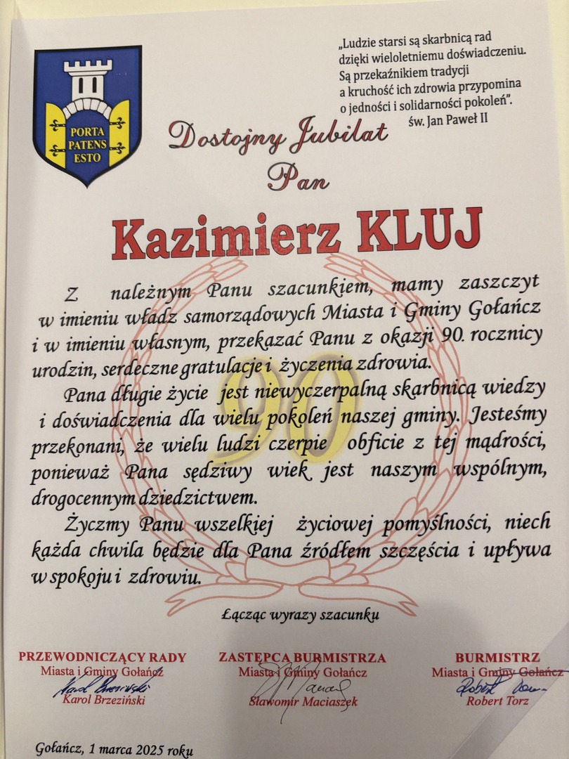 1 marca br. Robert Torz - Burmistrz Miasta i Gminy Gołańcz wraz z Karolem Brzezińskim – Przewodniczącym Rady Miasta i Gminy Gołańcz oraz Radnym i Sołtysem Chojny - Józefem Frieske, uczestniczyli w uroczystości 90. urodzin Pana Kazimierza Kluja z Chojny.