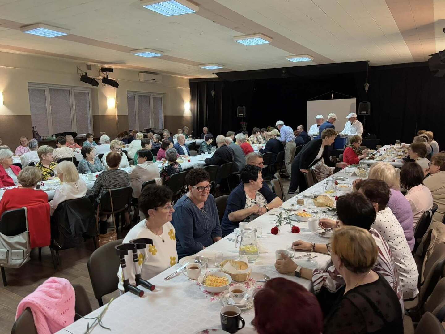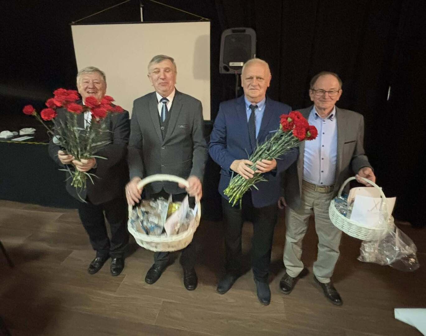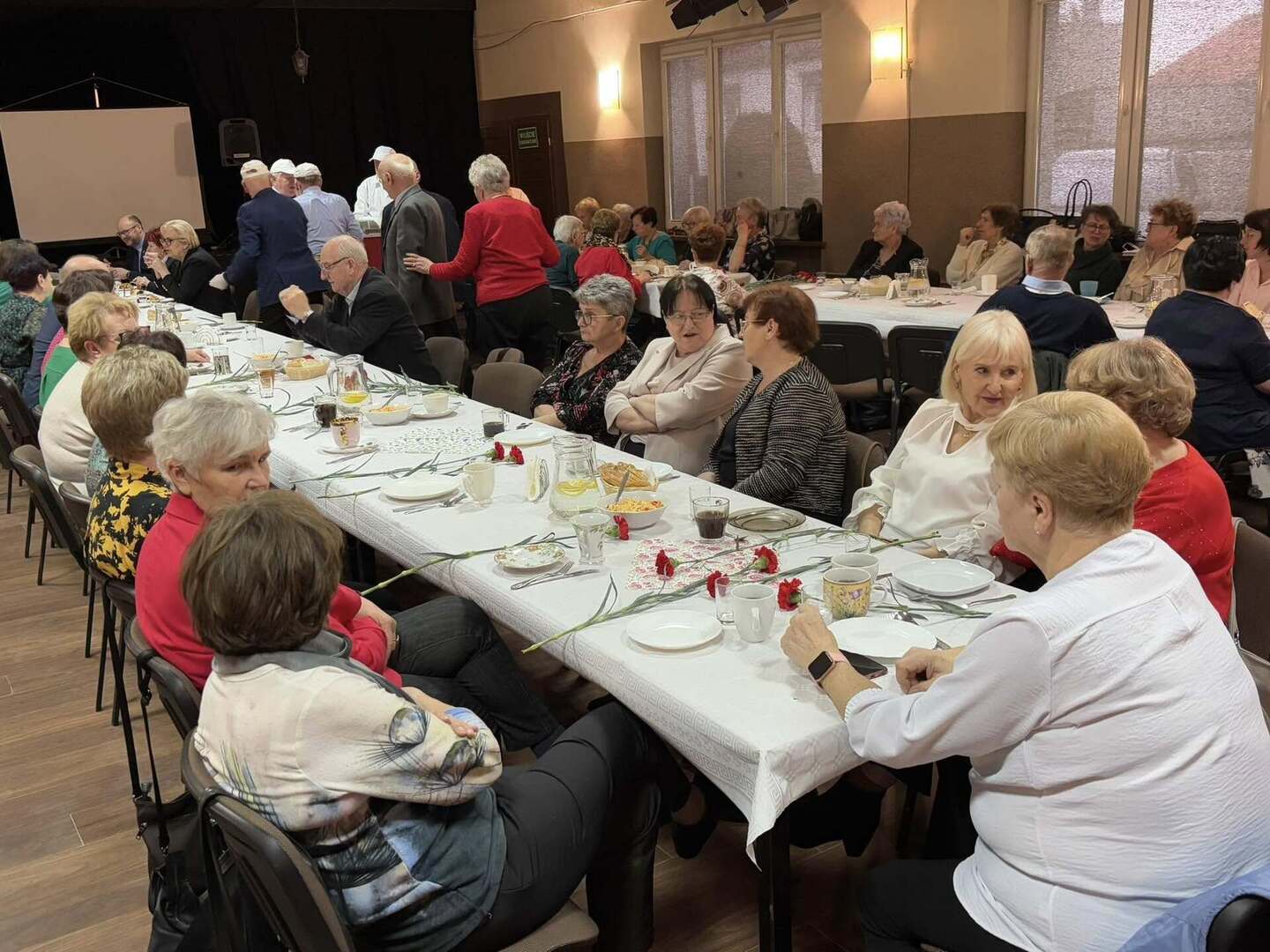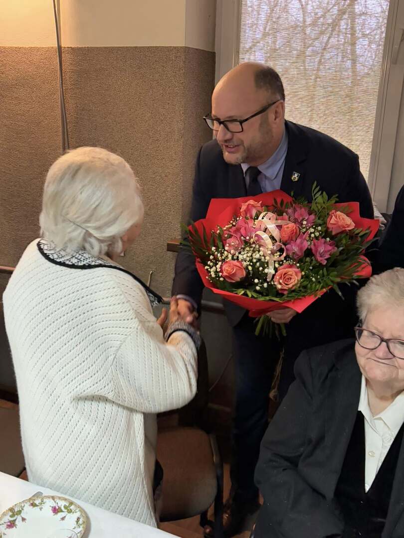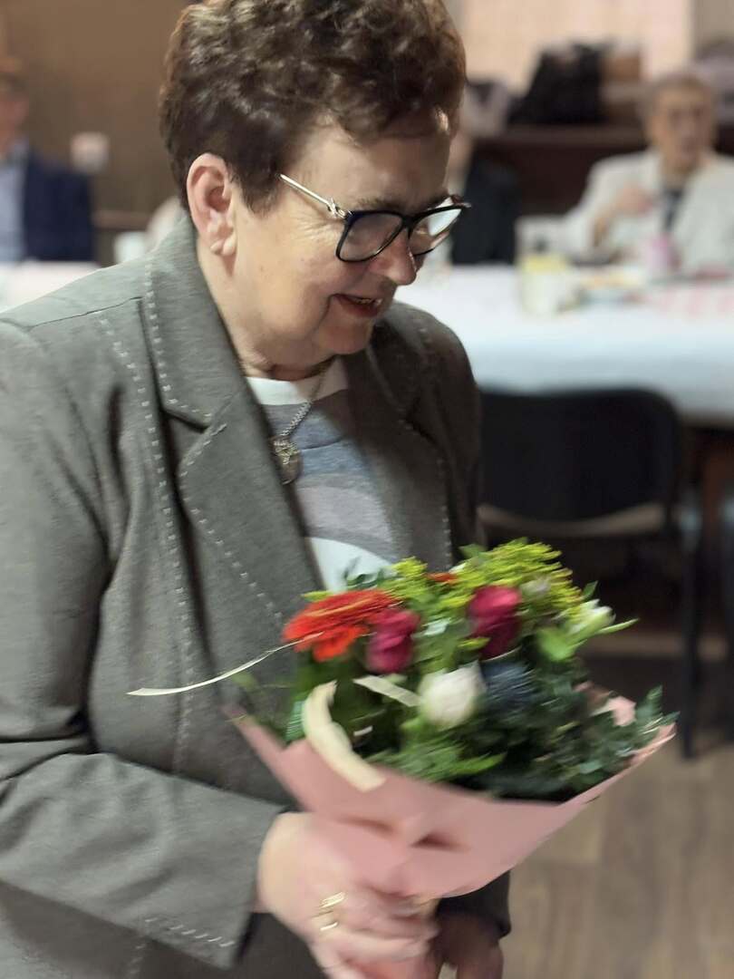 Nie zabrakło serdecznych życzeń dla Pań – tradycyjne goździki i upominki wręczył Prezes Stowarzyszenia wraz ze swoimi pomocnikami. Natomiast Burmistrz, Przewodniczący Rady oraz Zastępca Burmistrza przekazali w imieniu samorządu ciepłe słowa uznania i szacunku, a symboliczny bukiet kwiatów trafił do najstarszej seniorki obecnej na sali – członkini Stowarzyszenia, Pani Heleny Baczkowskiej.