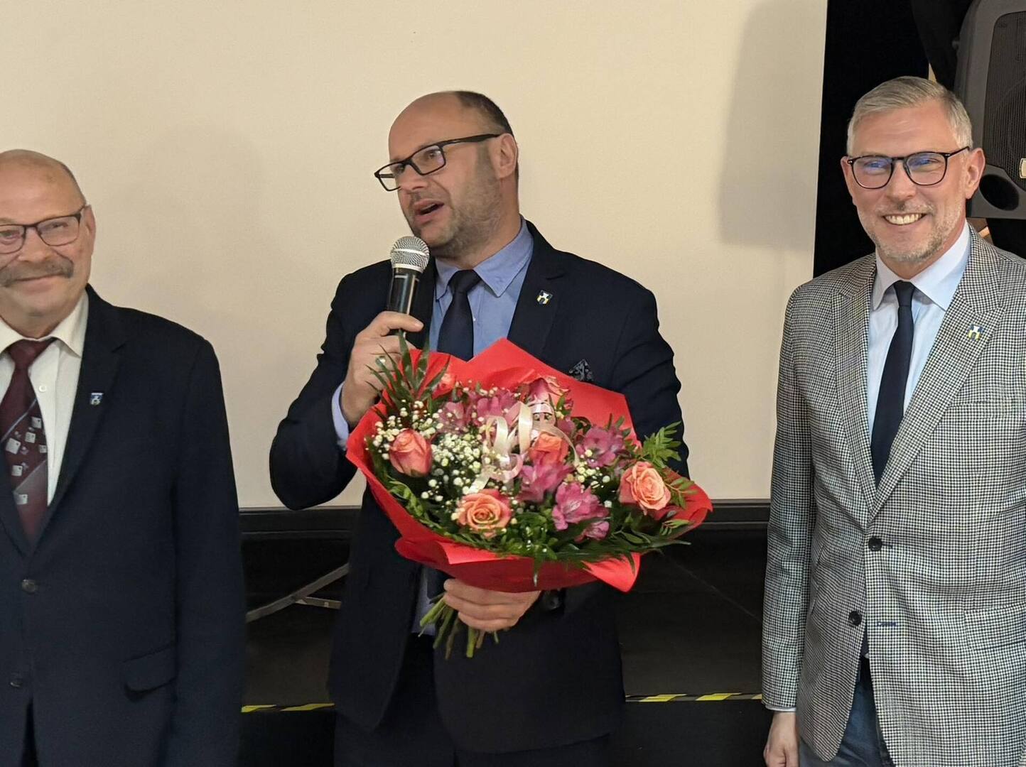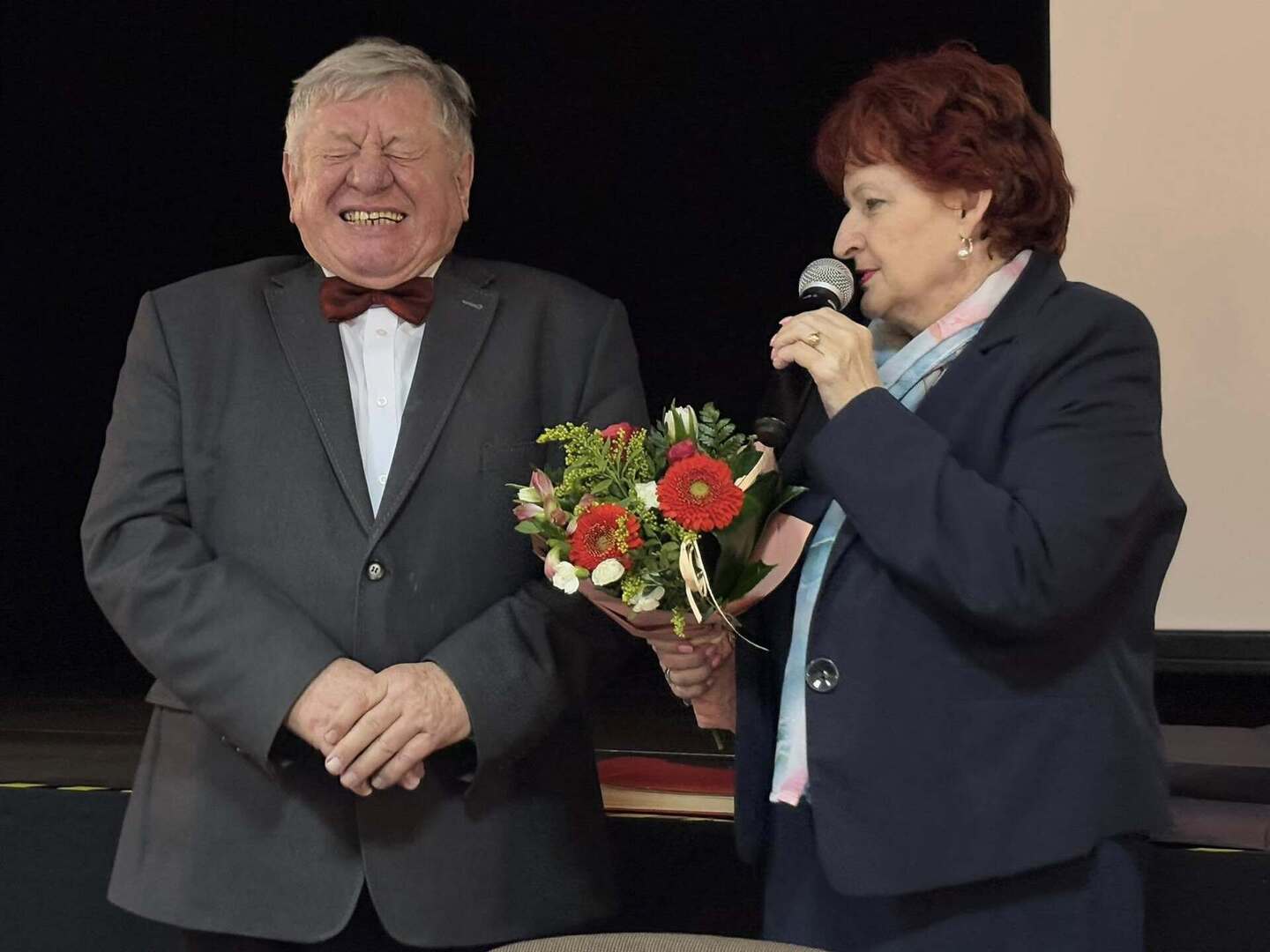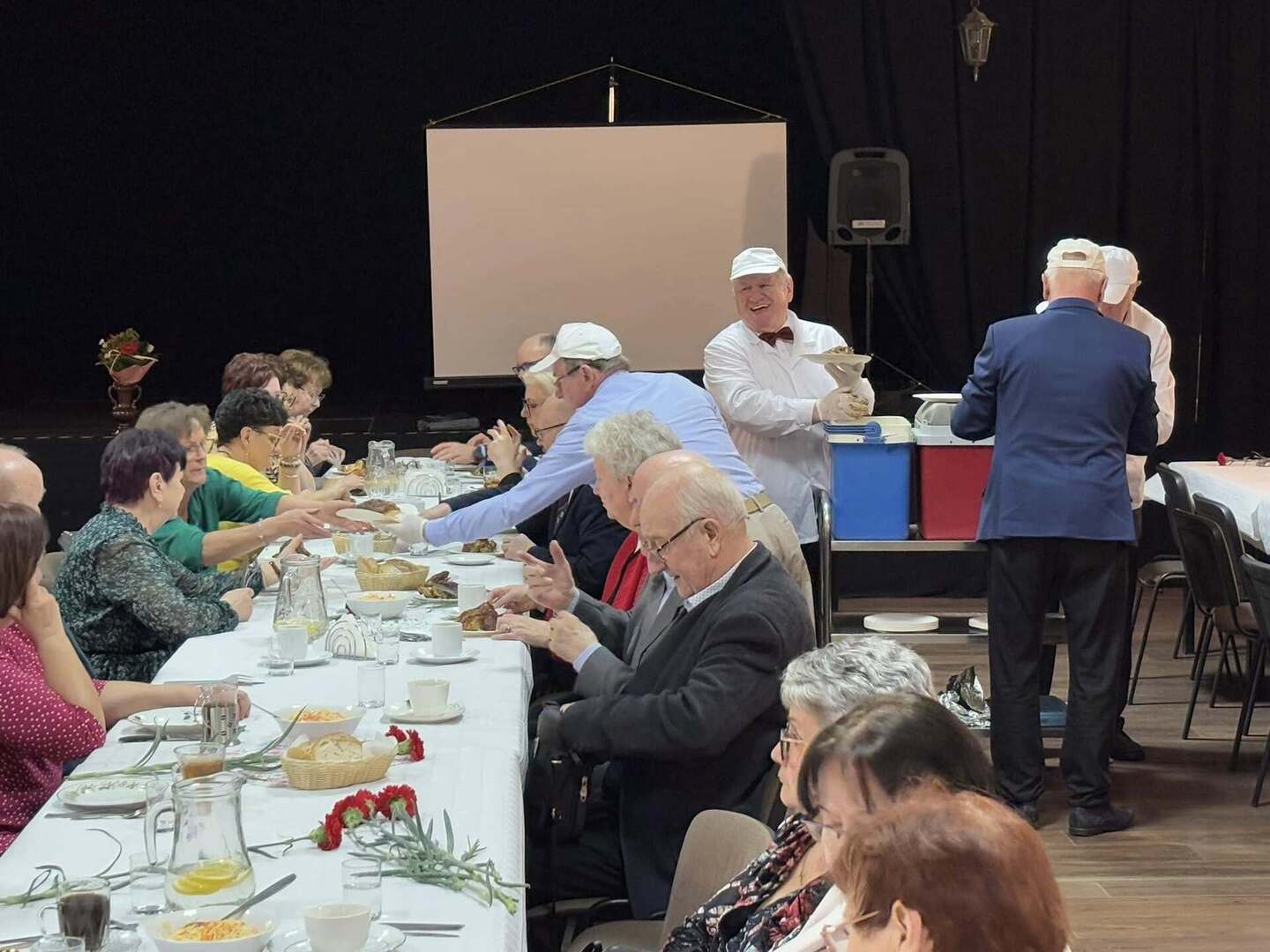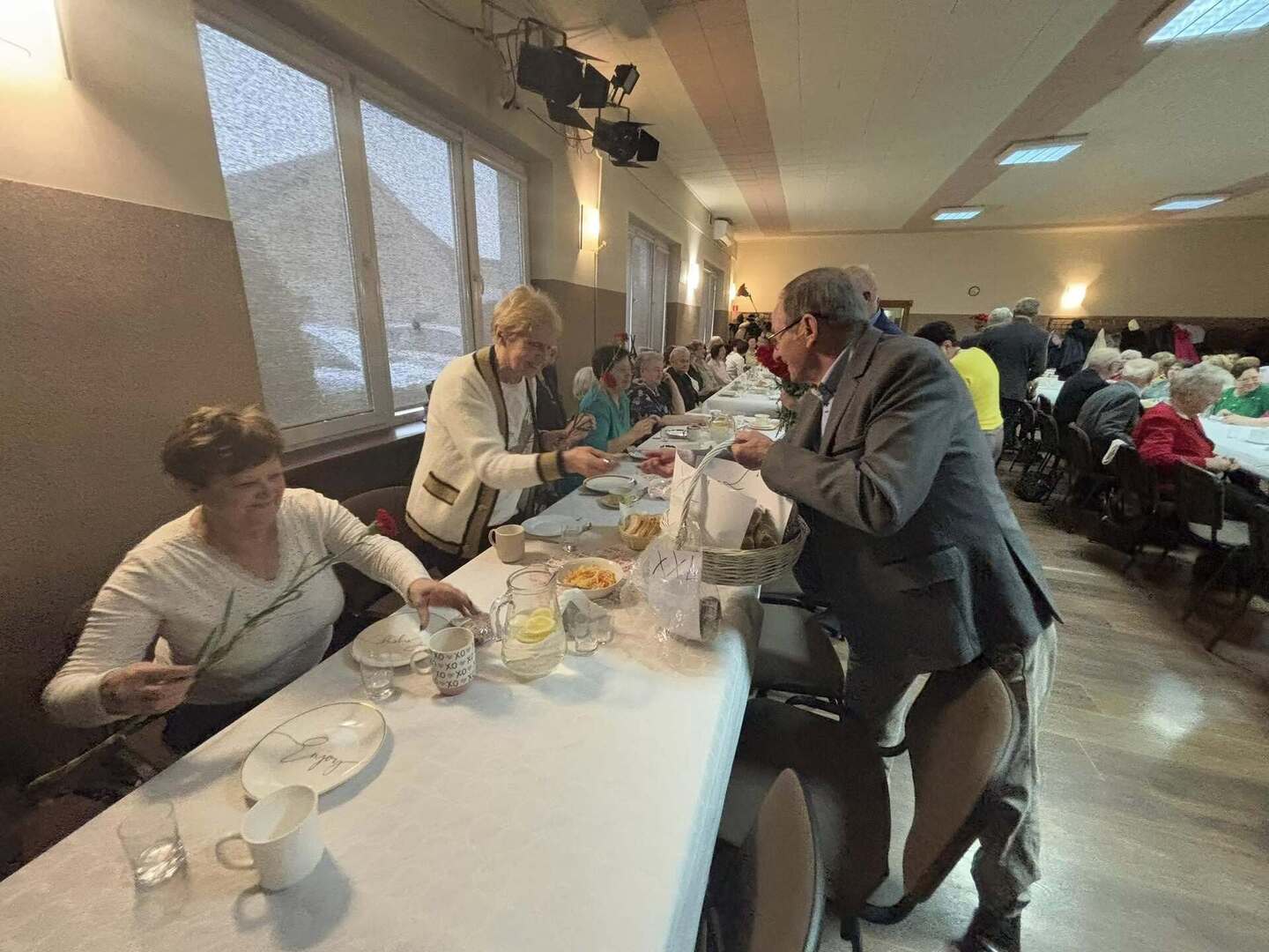 Nie zabrakło serdecznych życzeń dla Pań – tradycyjne goździki i upominki wręczył Prezes Stowarzyszenia wraz ze swoimi pomocnikami. Natomiast Burmistrz, Przewodniczący Rady oraz Zastępca Burmistrza przekazali w imieniu samorządu ciepłe słowa uznania i szacunku, a symboliczny bukiet kwiatów trafił do najstarszej seniorki obecnej na sali – członkini Stowarzyszenia, Pani Heleny Baczkowskiej.