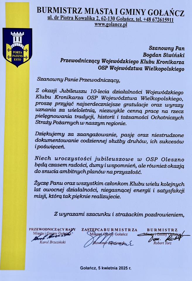 5 kwietnia 2025 roku w sali OSP w Olesznie odbyła się wyjątkowa uroczystość – Jubileusz 10-lecia Wojewódzkiego Klubu Kronikarza OSP Województwa Wielkopolskiego.
