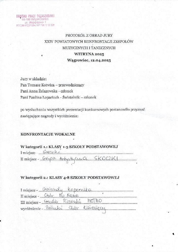 - I miejsce w kategorii zespołów wokalnych klas 1–3 szkół podstawowych