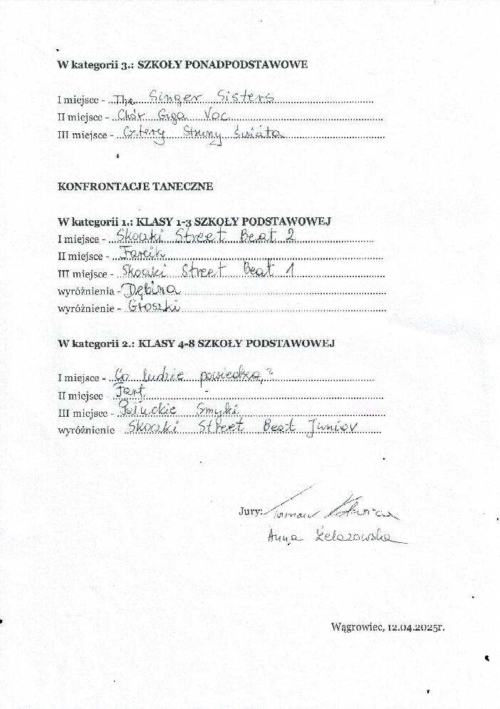 - Wyróżnienie w kategorii zespołów tanecznych klas 1–3 szkół podstawowych