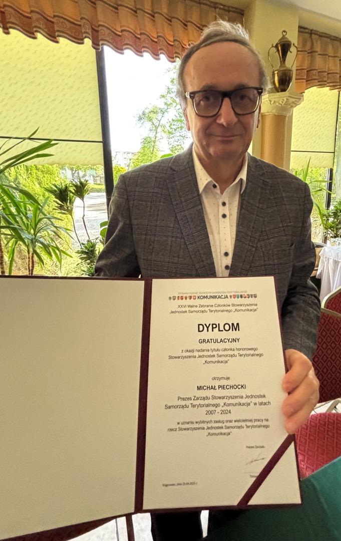 Uroczystym momentem było nadanie tytułu Członka Honorowego Stowarzyszenia Panu Michałowi Piechockiemu – byłemu Staroście i wieloletniemu Prezesowi Stowarzyszenia „Komunikacja” (2007–2024). Dziękujemy za wieloletnie zaangażowanie w rozwój infrastruktury transportowej regionu!