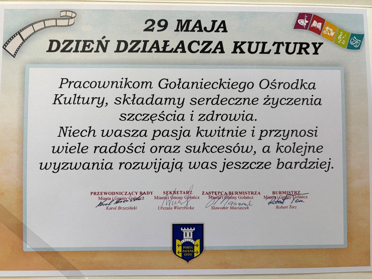 Z tej okazji Robert Torz - Burmistrz Miasta i Gminy Gołańcz, Sławomir Maciaszek - Zastępca Burmistrza Miasta i Gminy Gołańcz oraz Urszula Wierzbicka - Sekretarz Miasta i Gminy Gołańcz odwiedzili Gołaniecki Ośrodek Kultury, by złożyć osobiście serdeczne życzenia pracownikom tej instytucji, którzy rozwijają kulturę na naszym terenie.