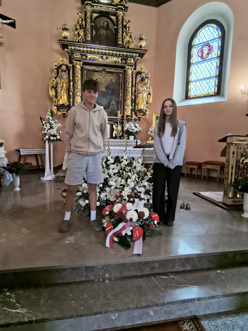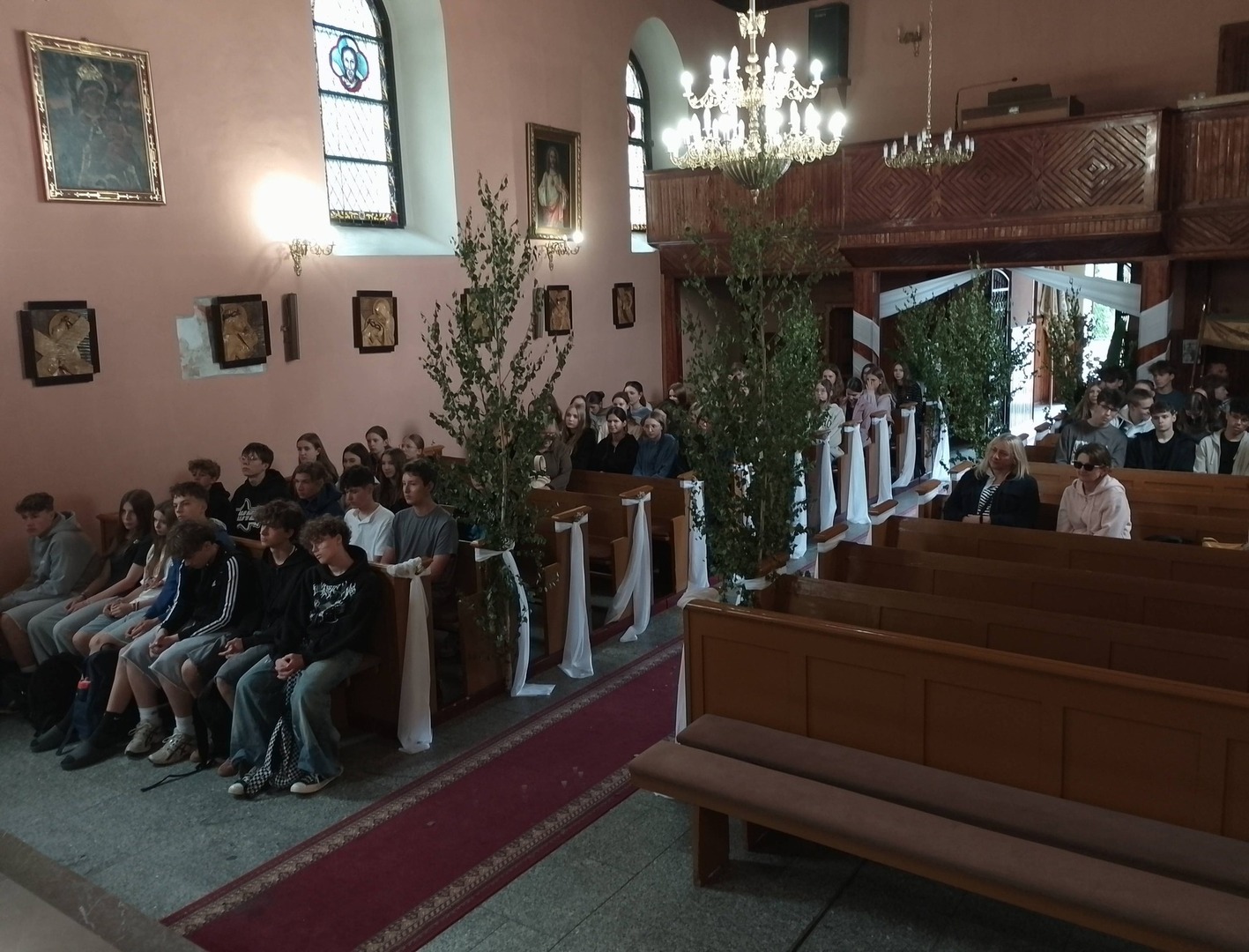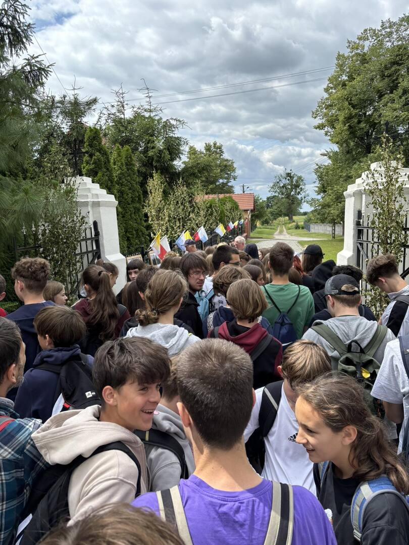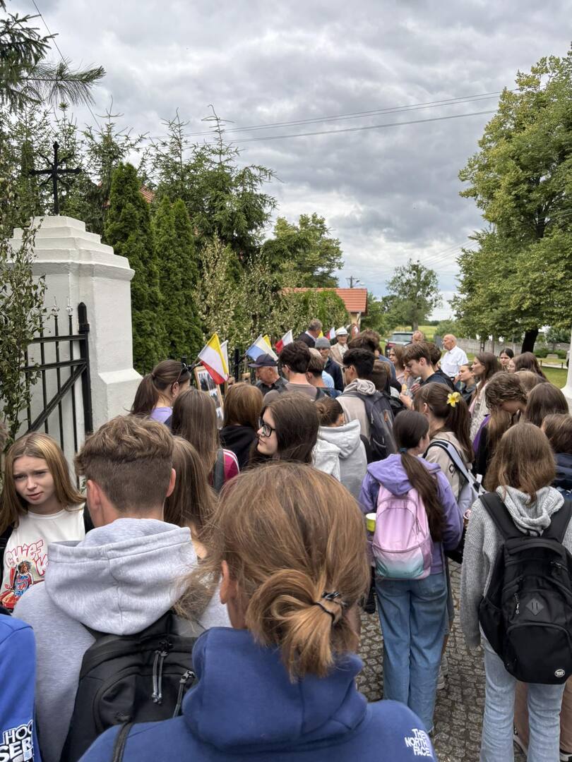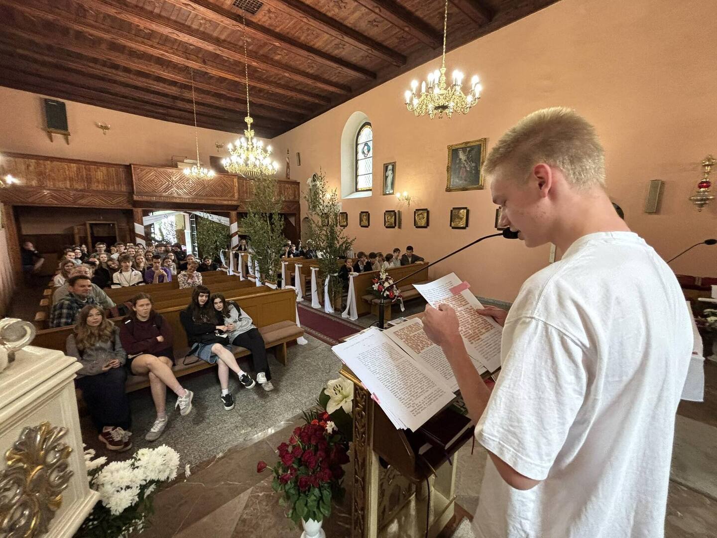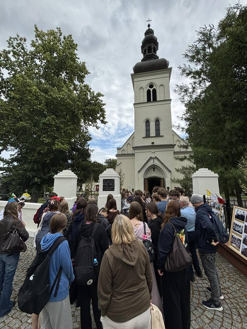 Młodzież przed odjazdem złożyła hołd swemu patronowi symboliczny wieniec na ołtarzu czeszewskiej świątyni - w pobliżu miejsca spoczynku Karola Libelta w krypcie grobowej.