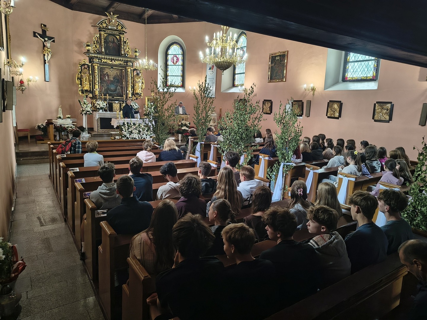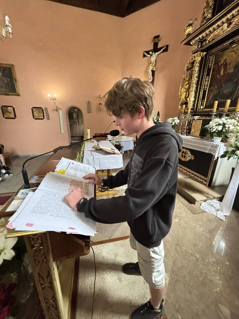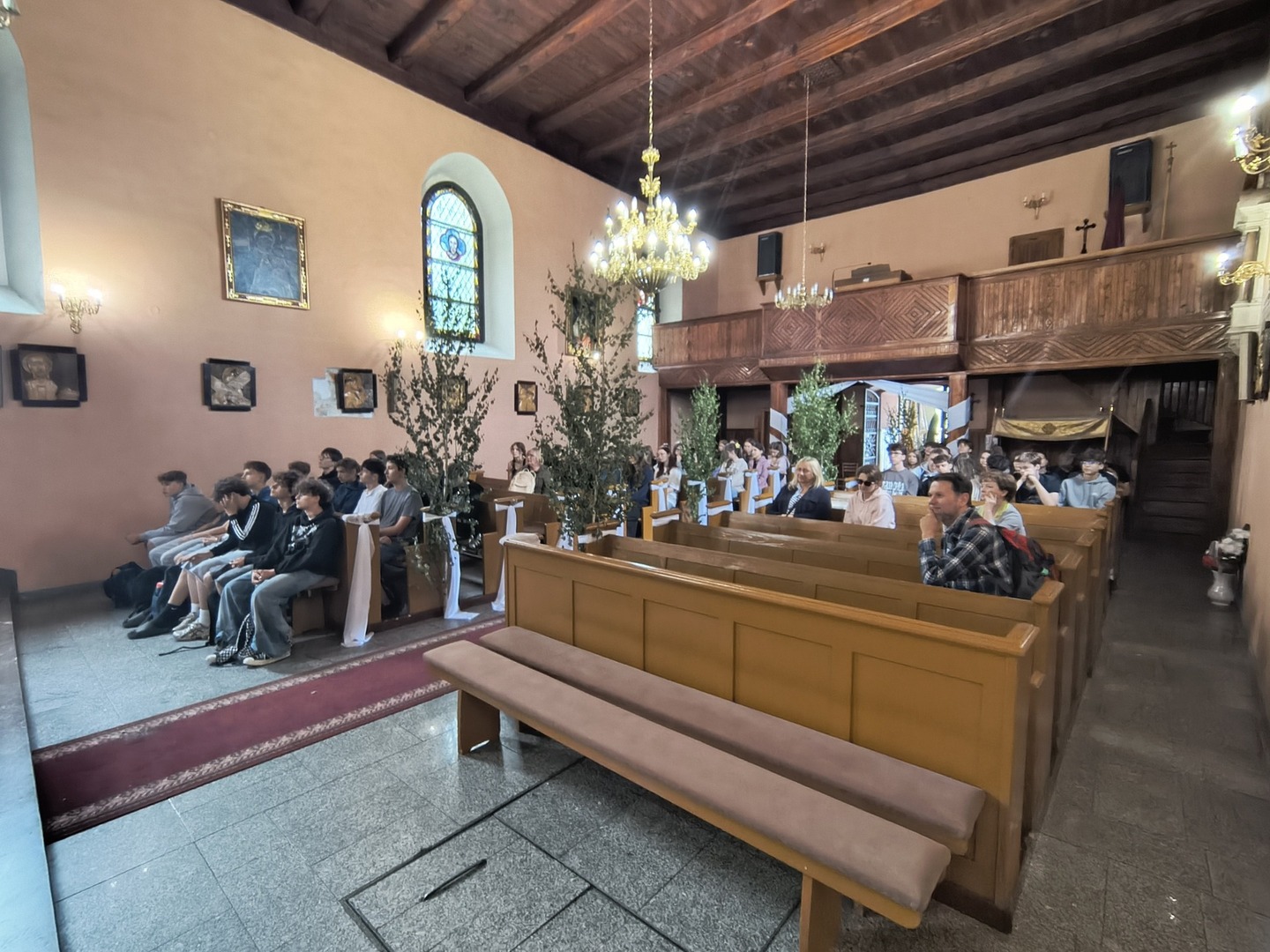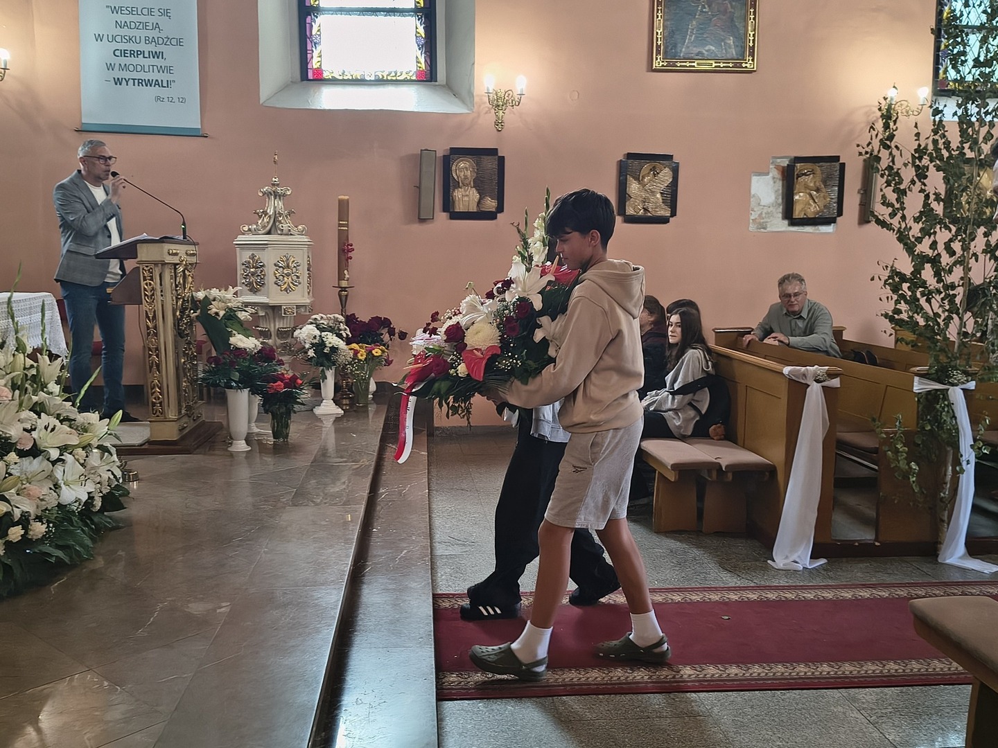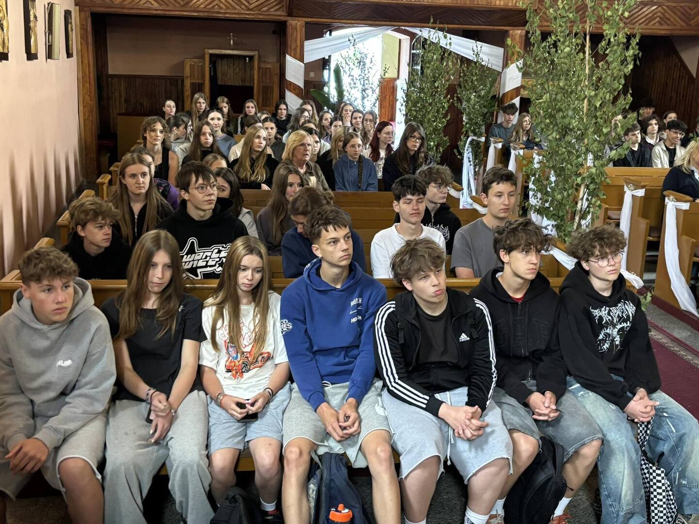 Młodzież przed odjazdem złożyła hołd swemu patronowi symboliczny wieniec na ołtarzu czeszewskiej świątyni - w pobliżu miejsca spoczynku Karola Libelta w krypcie grobowej.