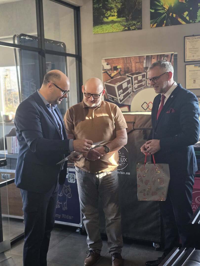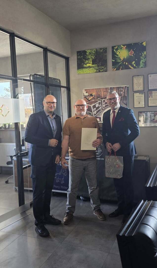Podczas spotkania Burmistrz i jego Zastępca przekazali właścicielowi oraz pracownikom firmy list gratulacyjny i drobny upominek, dziękując za lata pracy, rozwój oraz wkład w budowanie pozytywnego wizerunku lokalnego biznesu.