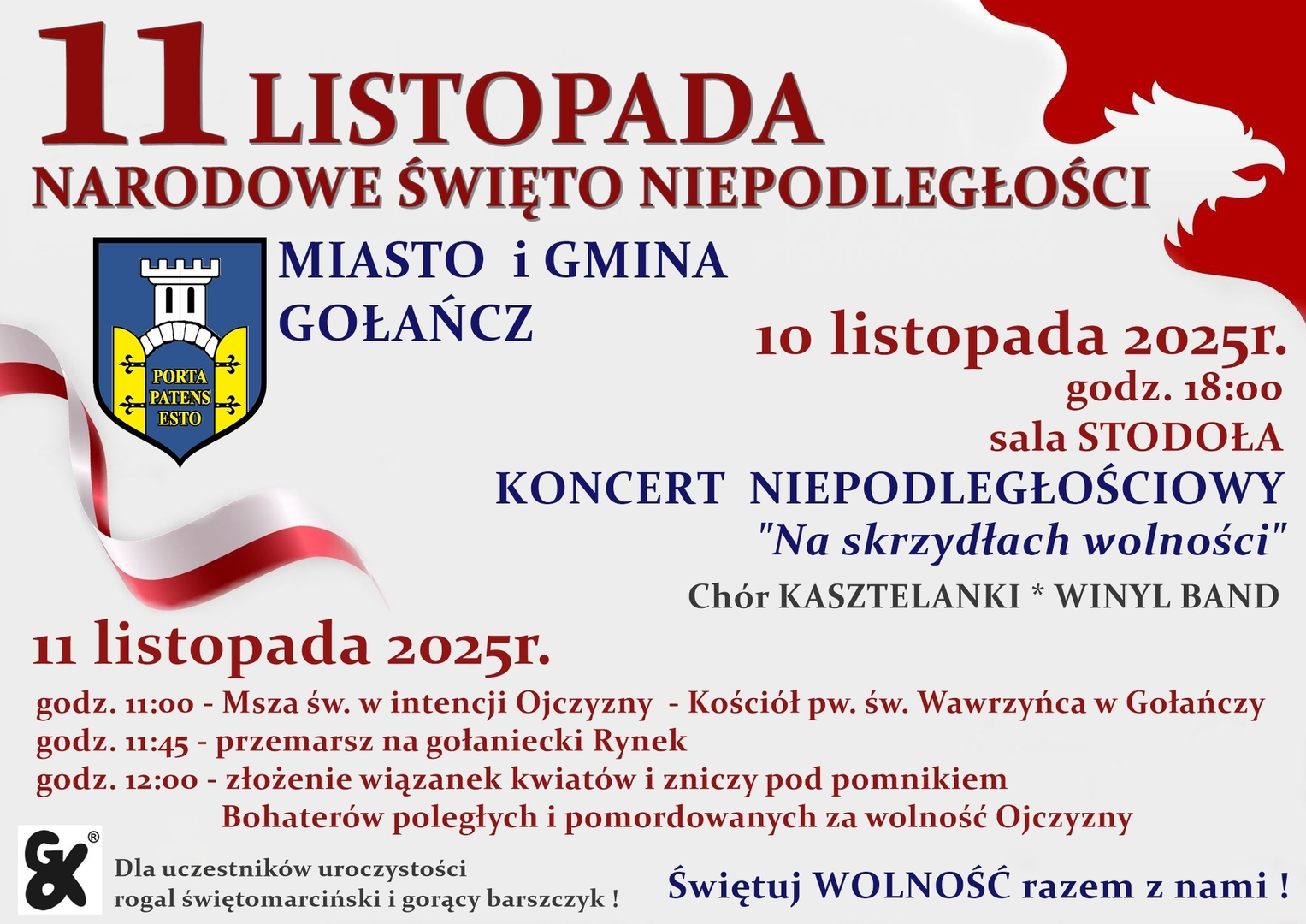 Zbliża się jedno z najważniejszych świąt w historii naszego kraju - Narodowe Święto Niepodległości. Serdecznie zapraszamy wszystkich mieszkańców Miasta i Gminy Gołańcz do wspólnego świętowania 11 listopada.