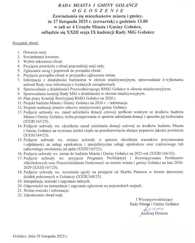Zapraszamy na XXIII sesję IX kadencji Rady Miasta i Gminy Gołańcz, która odbędzie się 27 listopada 2025 r. w czwartek o godz. 13.00.