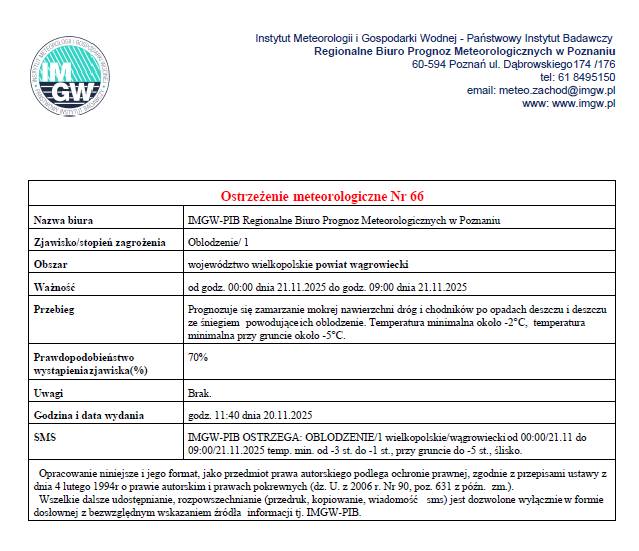 Regionalne Biuro Prognoz Meteorologicznych w Poznaniu wydało komunikat nr 66 - oblodzenie, obowiazujący od: 20.11.2025 godz. 00:00 do: 21.11.2025 godz. 9:00 obejmujący powiaty: chodzieski, czarnkowsko-trzcianecki, gnieźnieński, gostyński, grodziski, jarociński, kaliski, Kalisz, Konin, koniński, kościański, krotoszyński, leszczyński, Leszno, międzychodzki, nowotomyski, obornicki, ostrowski, ostrzeszowski, pilski, pleszewski, Poznań, poznański, rawicki, słupecki, szamotulski, średzki, śremski, turecki, wągrowiecki, wolsztyński, wrzesiński i złotowski.