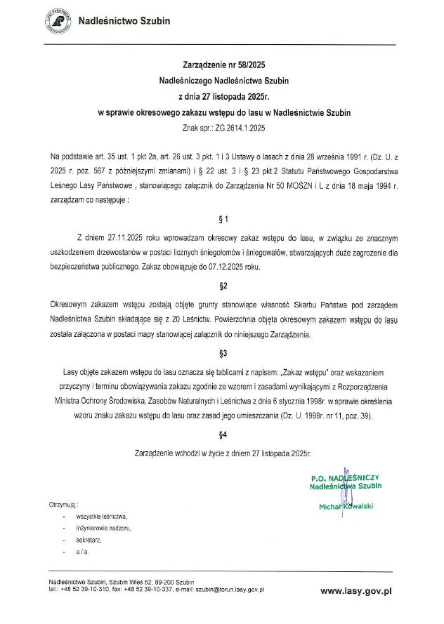 Nadleśnictwo Szubin wprowadziło okresowy zakaz wstępu do lasu obowiązujący od 27 listopada do 7 grudnia.
