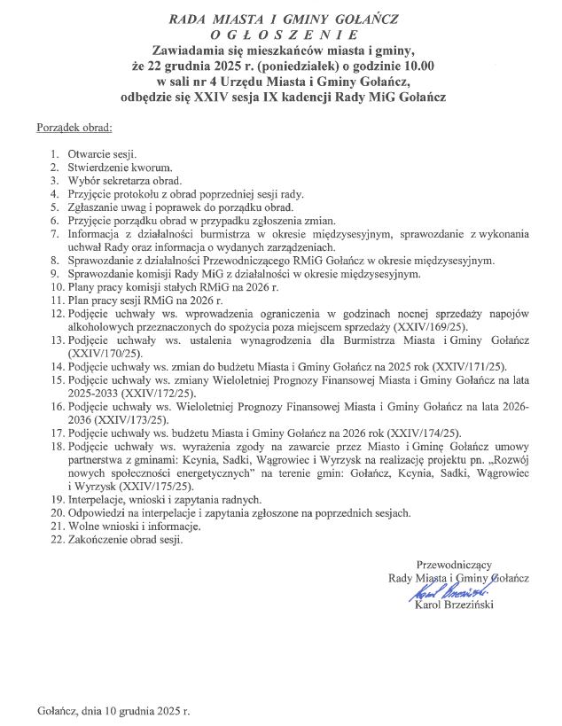 Zapraszamy na XXIV sesję IX kadencji rady MiG Gołańcz 22 grudnia 2025 r. w poniedziałek o godz. 10.00.