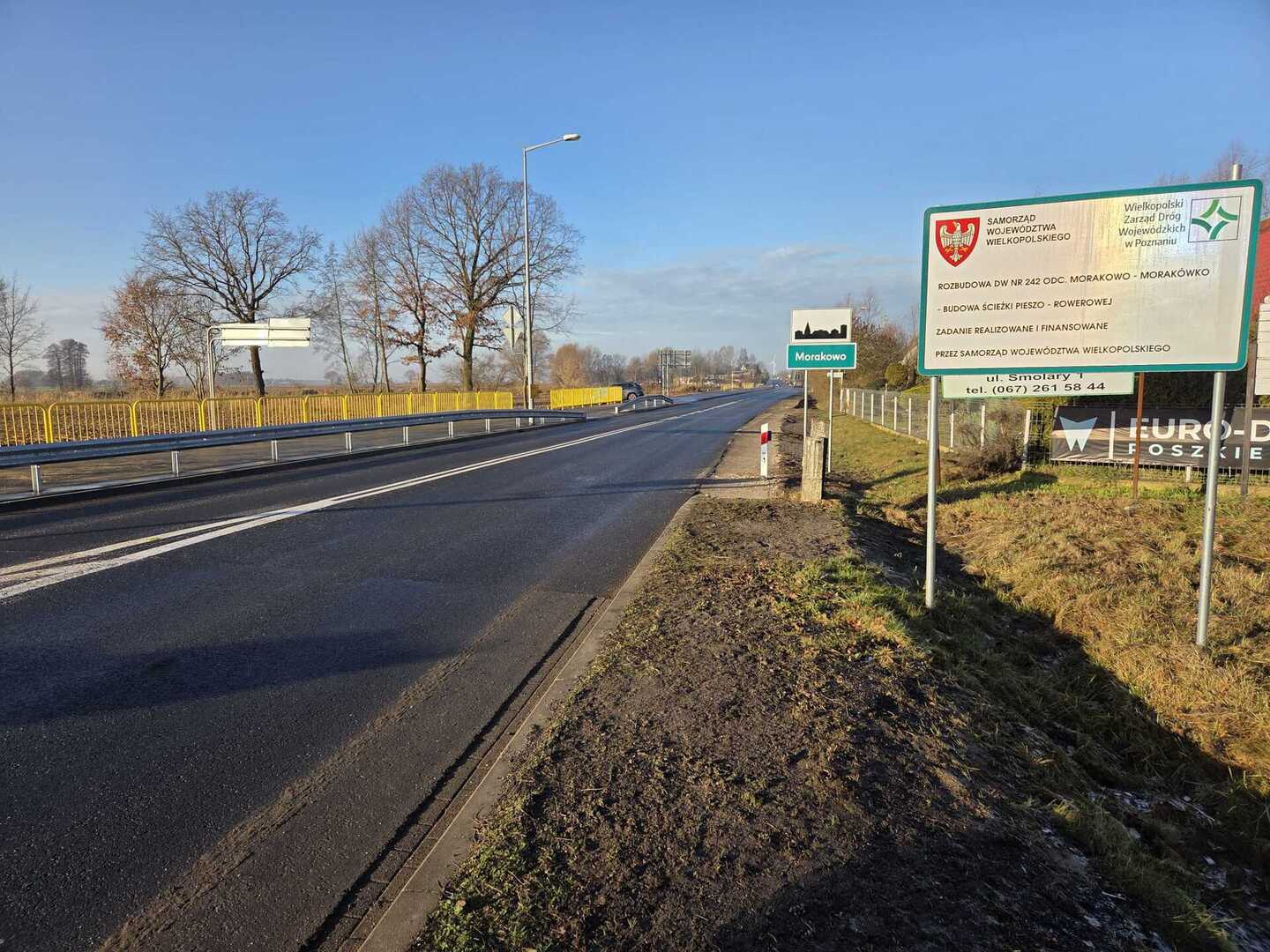 Zakończona została realizacja pierwszego etapu zadania w ciągu drogi wojewódzkiej nr 242 na odcinku Morakowo – Morakówko. Centralnym elementem tej inwestycji było wykonanie nowego ciągu pieszo-rowerowego, który znacząco poprawił bezpieczeństwo i komfort niechronionych uczestników ruchu.