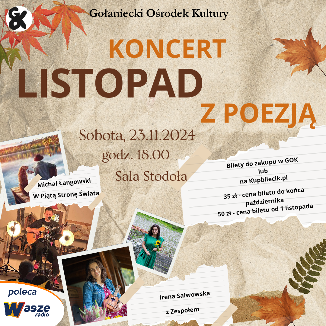 Serdecznie zapraszam na wyjątkowy koncert „Listopad z Poezją”, który odbędzie się 23 listopada 2024 roku o godzinie 18:00 w Sali Stodoła, organizowany przez Gołaniecki Ośrodek Kultury. W ramach tego poetycko-muzycznego wieczoru wystąpi Michał Łangowski – znany przede wszystkim z działalności w zespole „Cisza Jak Ta”. Michał, będący liderem i twórcą wielu utworów zespołu, obecnie rozwija solowy projekt muzyczny pod nazwą „Pomiędzy Ciszą a ciszą”, w którym dzieli się piosenkami powstałymi z inspiracji współczesną poezją.