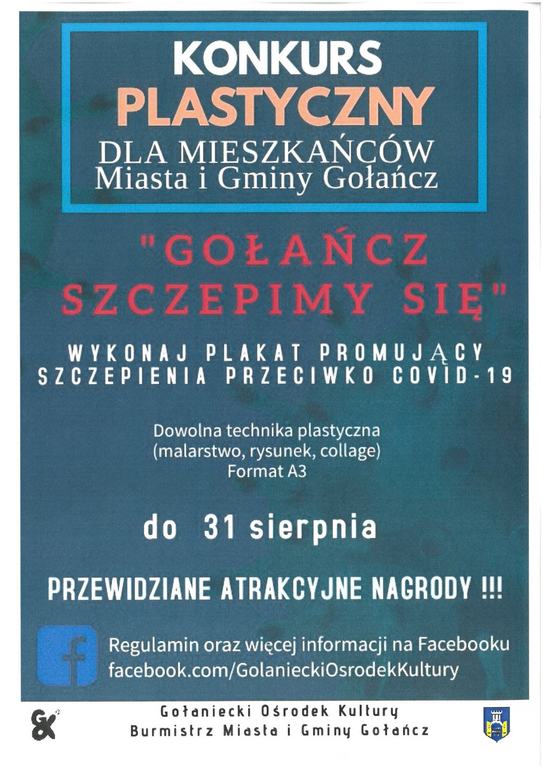 Wykonaj plakat promujący szczepienia przeciwko COVID-19 zgarnij nagrody! Technika dowolna (malarstwo, rysunek, collage), format A3. Termin do 31 sierpnia.
