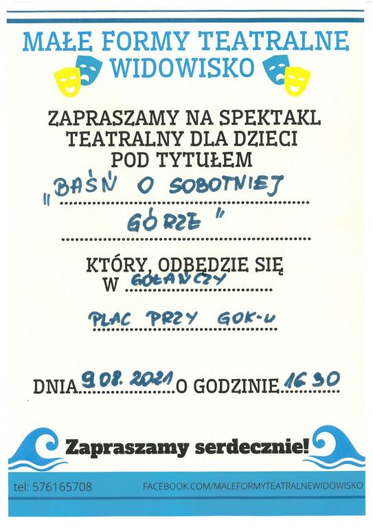Zapraszamy na spektakl teatralny dla dzieci pod tytułem "Baśń o Sobotniej Górze", który odbędzie się w Gołańczy na placu przy GOK-u.