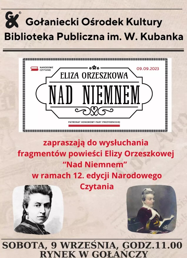 Wielkimi krokami zbliża się kolejna - 12. edycja Narodowego Czytania. Podczas tegorocznego wydarzenia usłyszą państwo fragmenty utworu "Nad Niemnem" Elizy Orzeszkowej - jednej z najwybitniejszych powieściopisarek polskiego pozytywizmu. Serdecznie zapraszamy do uczestniczenia w tym niezwykłym wydarzeniu by przenieść się w świat polskiego społeczeństwa drugiej połowy XIX wieku, przedstawionego w społeczno-obyczajowej powieści powstałej w 1888 roku.