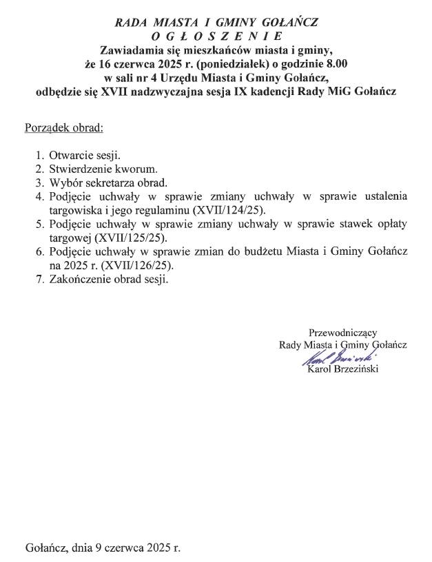 XVII nadzwyczajna sesja IX kadencji Rady Miasta i Gminy Gołańcz